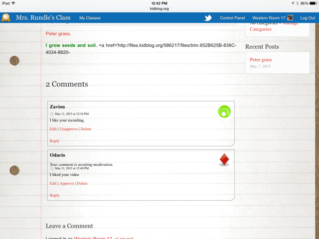 Students are excited to see their work published on the Internet, and we feel secure using Kidblog because we can control who has access to it. So far, most students have published videos on the blog.